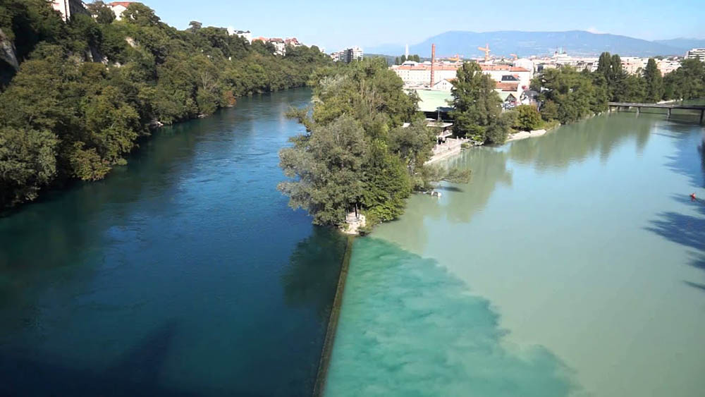 В швейцарской Женеве сливаются две реки разного цвета и создают уникальное природное явление. Воды реки Рона голубого цвета, а Арвы — коричневого, но даже при слиянии эти воды не перемешиваются между собой. Поэтому у новой реки (а она носит имя большей реки — Роны) чётко видна водная граница между двумя цветами. Это объясняется разной плотностью рек — воды Роны менее плотные, а воды Арвы, которая на своем пути вымывает множество горных пород, значительно плотнее.