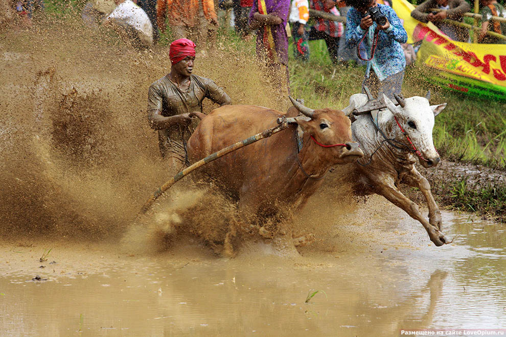 Гонка на быках — это соревнование, которое проходит в деревне Анандапалли в южной части штата Керала после сбора урожая. Пара запряженных в ярмо быков на скорость вспахивают рисовое поле размером с футбольное. В это время их хозяева висят на хвостах быков или сидят в упряжках.