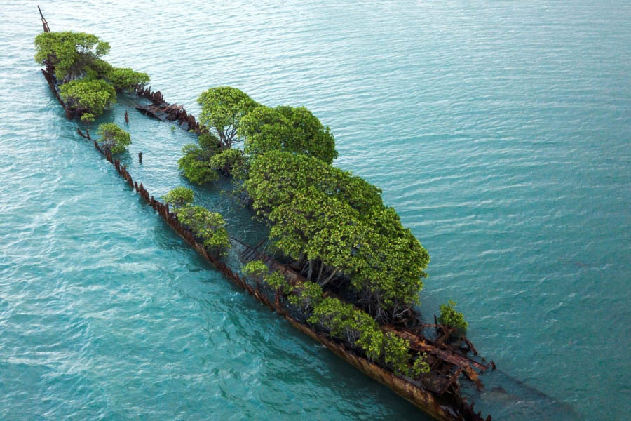 Деревья превратили затонувший корабль в зелёный остров.
