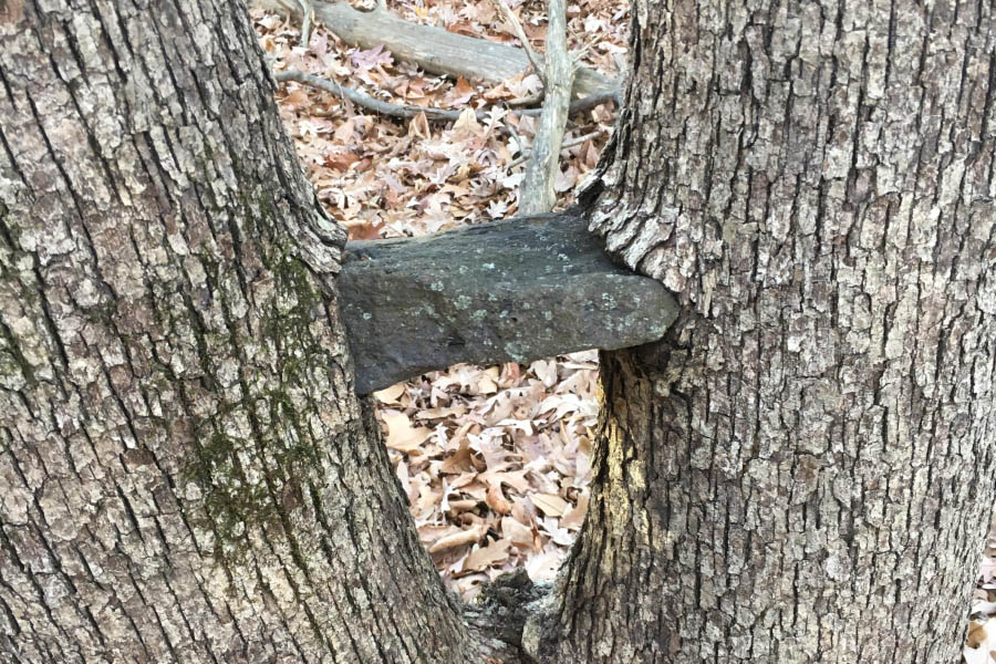 Десять лет назад дети положили между ветками этот камень. Сегодня дерево продолжает поглощать его.