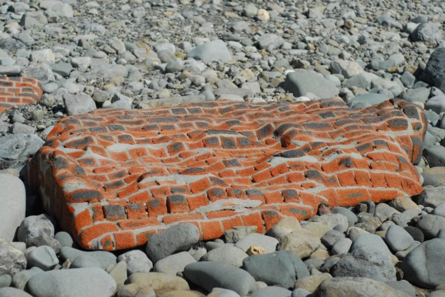 Море отшлифовало фрагмент кирпичной стены. Теперь прочная кладка стала похожей на каменные волны.