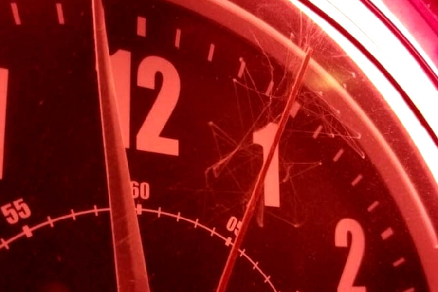 Паук — властелин времени. Он пробрался в часы и оплёл паутиной секундную стрелку. Теперь стрелка не двигается, стоит на месте.