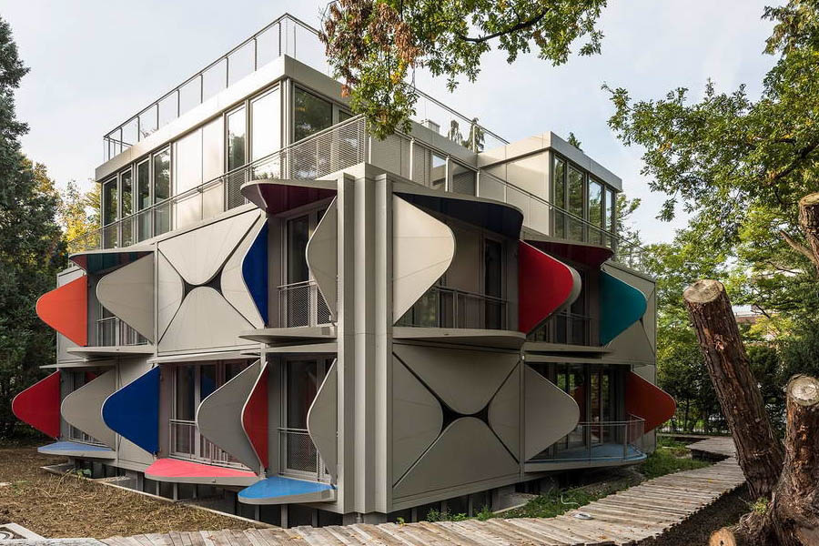Посмотрите на оригинальные ставни в этом доме. Они открываются автоматически, образуя удобные балконы и террасы. В закрытом состоянии ставни имеют спокойный серый цвет, в распахнутом играют яркими красками.