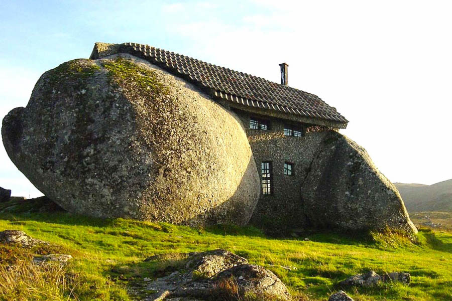 Посмотрите на дом Casa do Penedo, зажатый между огромных камней. Не правда ли, он напоминает древнее жилище? В здании нет света и отопления, оно освещается свечами и отапливается камином. На второй этаж ведёт вырезанная в камне лестница.