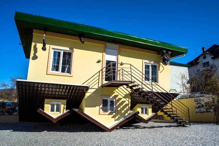 В перевёрнутом доме вся мебель прикреплена к потолку, поэтому она находится над головами у посетителей. Внутри такого дома создаётся ощущение, что ты ходишь не по полу, а по потолку.