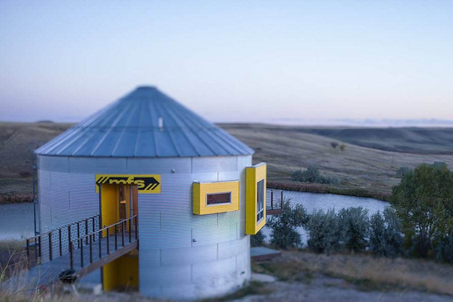 Если у вас на примете есть бесхозный зерновой бункер, из него можно сделать уютный двухэтажный домик, примерно такой, как на фото. Добавьте к домику пару окон, входную дверь, небольшой балкон — и можно заселяться.