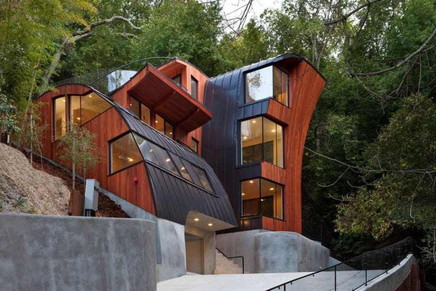 Этот дом называют извивающимся за его эффектную динамичную форму. Его изогнутые деревянные и металлические фасады отлично смотрятся на фоне окружающего горного пейзажа.