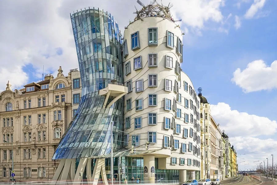 Танцующее здание в Чехии напоминает пару танцоров: башня справа имеет сходство с коренастой мужской фигурой, башня слева похожа на танцовщицу в летящем платье. Эта достопримечательность является национальным символом Чехии.