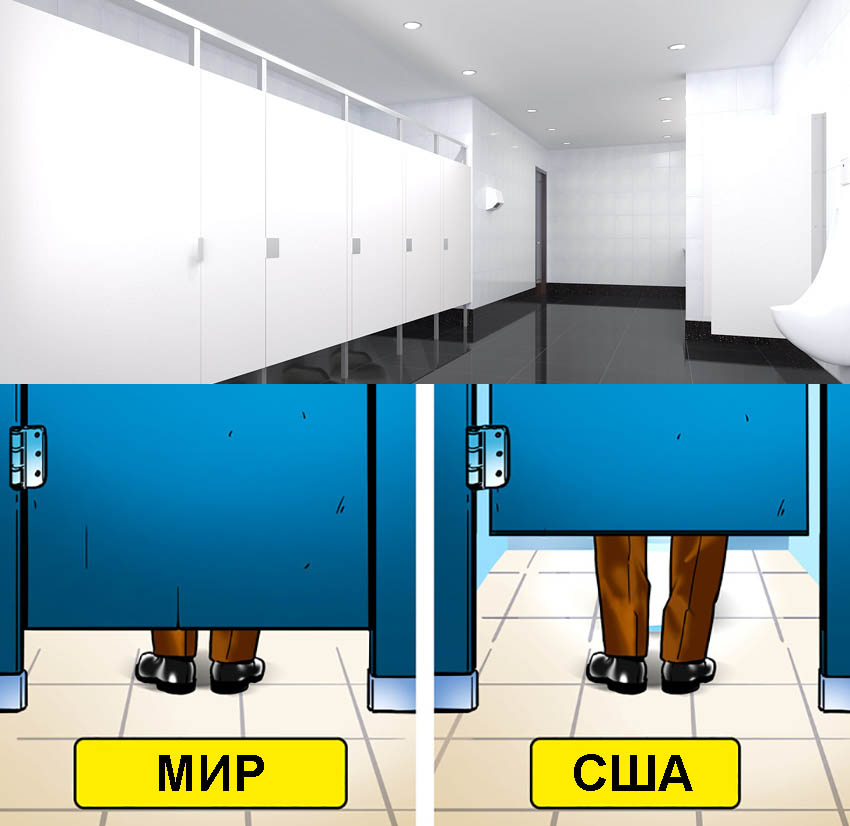 Общественные туалеты США удивляют иностранцев, так как кабинки не такие закрытые, как мы привыкли. Речь о щелях по бокам и особенно крупных зазорах в нижней части. Ни приезжие, ни коренные жители Америки не могут дать точного комментария по этому моменту.