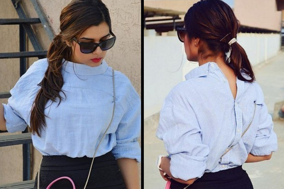 Мужская рубашка — ещё одна очень удобная и стильная вещь. Причём её можно носить совсем по-разному: либо накинуть поверх топа вместо кардигана, либо подвязать на животе или даже надеть задом наперёд и слегка оголить спину, расстегнув пуговицы. Вариантов множество.