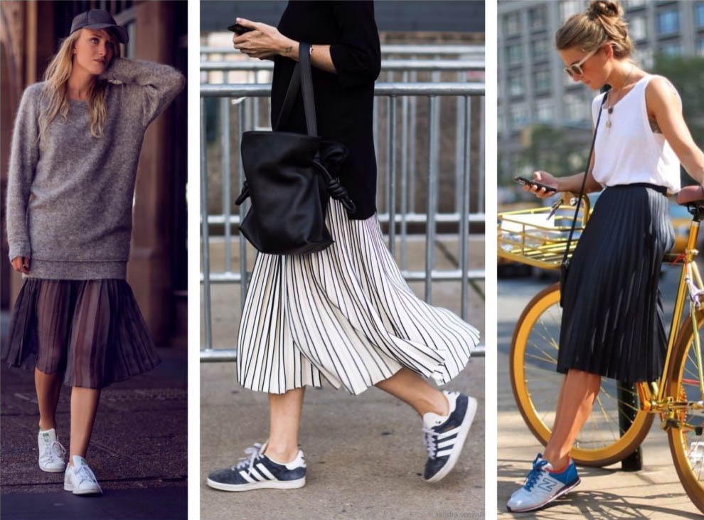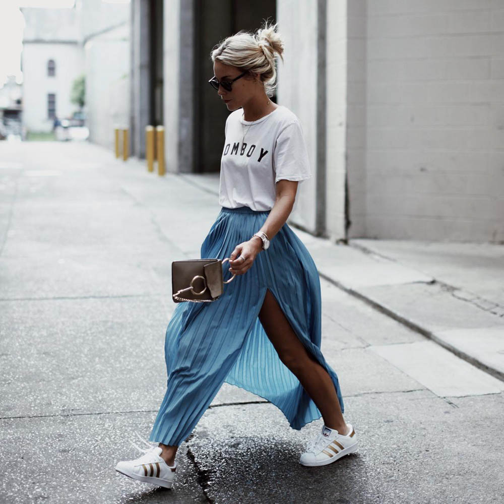 Плиссированные юбки тоже не остались в стороне. Их также можно носить и с кедами, и с балетками. Возьмёте в дорогу одну юбку и пару рубашек / футболок, и вот несколько образов готовы.