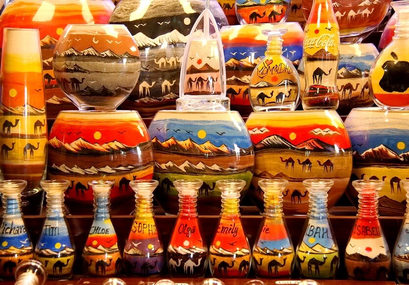 В столице Эмиратов можно найти красивые шали, накидки, нарядные костюмы для танца живота. Детям понравятся песочные картины и прозрачные бутылочки с разноцветным песком, а также сувениры с верблюдом — символом Дубая.