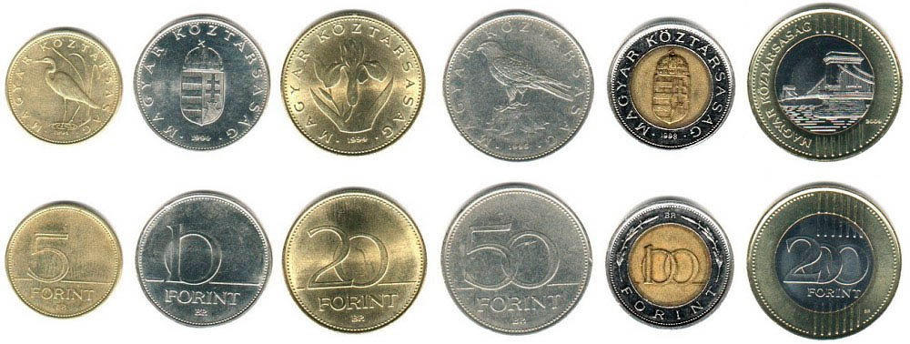Национальная валюта Венгрии — венгерский форинт (HUF). В обращении имеются монеты достоинством 5, 10, 20, 50, 100 и 200 форинтов (последние две изготовлены из сплава двух металлов). Номинал бумажных банкнот — 500, 1000, 2000, 5000, а также 10 000, 20 000 и 100 000 форинтов.