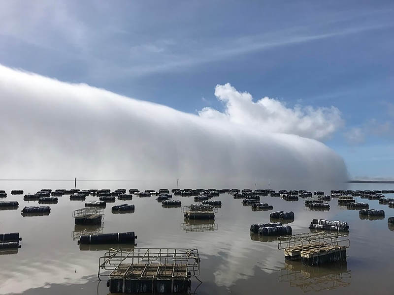 Белая стена на фото выглядит зловеще. Она похожа на вертикальное сплошное облако или цунами. Но это всего лишь густой туман, наступающий на побережье.
