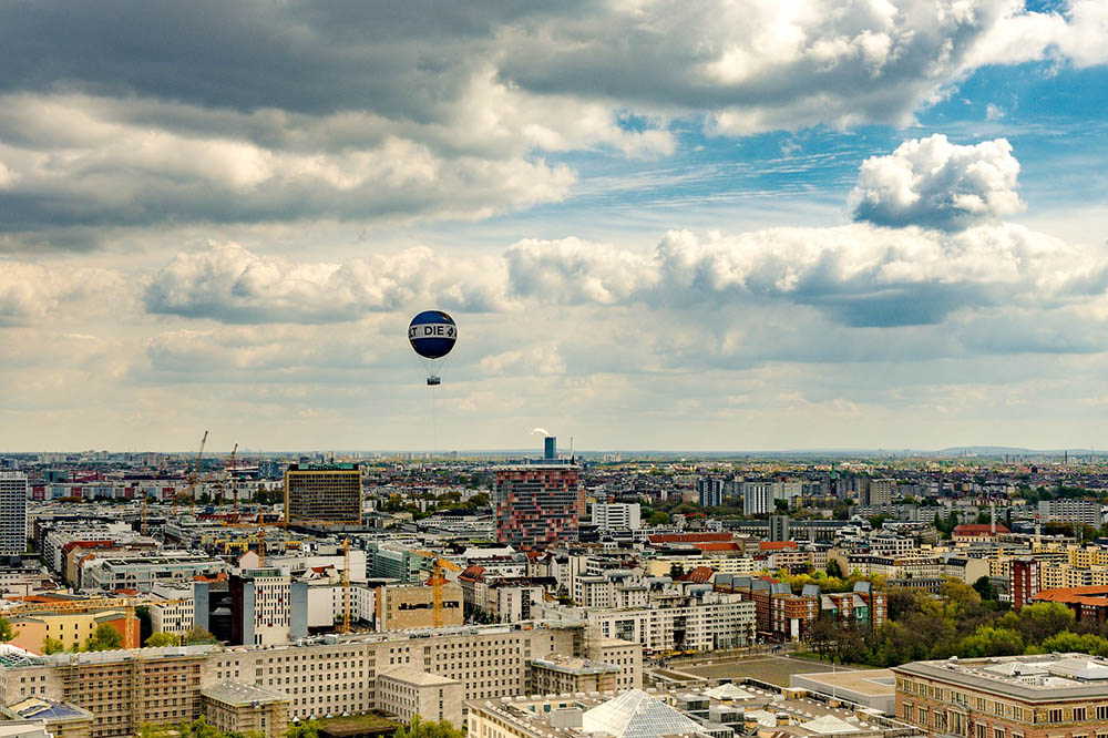 Как в Париже отовсюду видна Эйфелева башня, так в Берлине практически из любой точки города можно видеть в небе аэростат Die Welt. Каждые 15 минут шар поднимается на высоту 150 метров, в корзине помещаются 30 человек. Недалеко от него расположены Бранденбургские ворота и фрагменты берлинской стены.