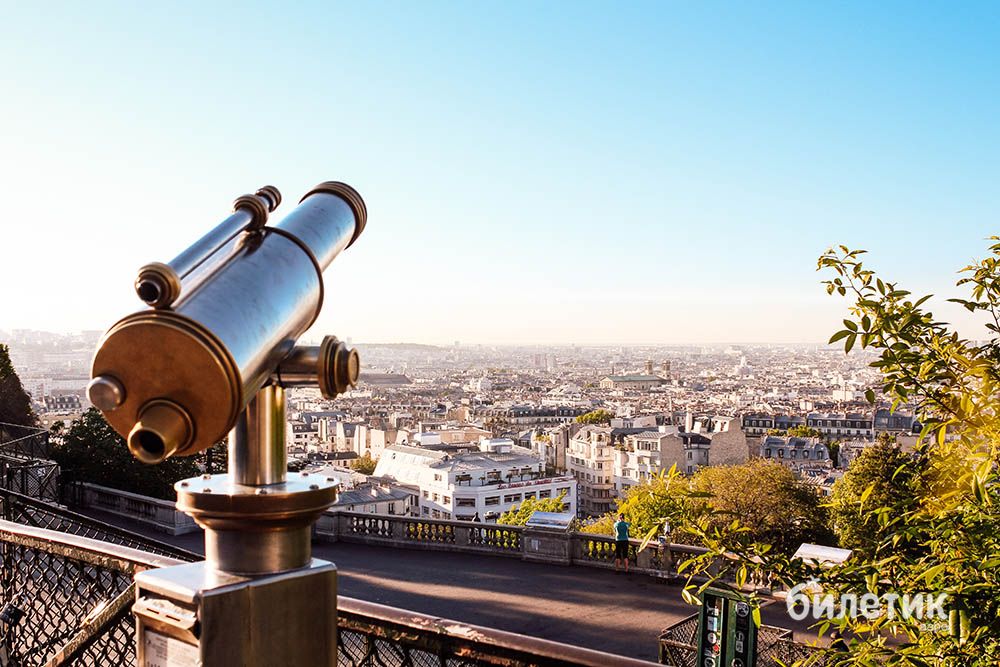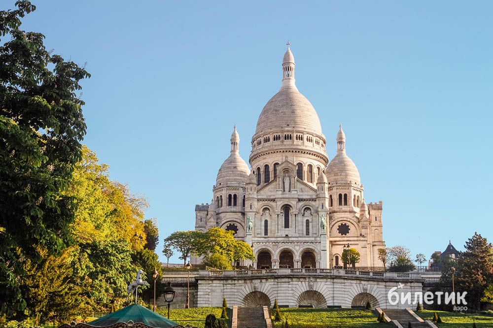 Белоснежная базилика Сакре-Кёр — главное украшение Монмартра. Она расположена на высоте 130 метров. Бесплатная смотровая площадка есть у подножия церкви, платная — в куполе базилики.