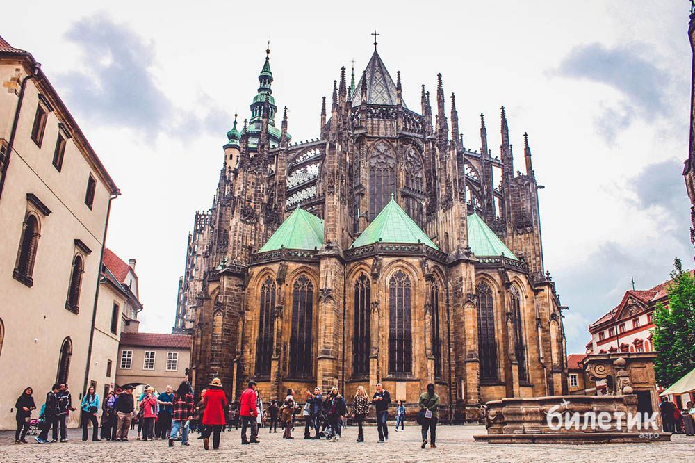 Огромный готический собор — главная достопримечательность как Пражского града, так и самой Праги. В его южной башне находится смотровая площадка. При этом туристов здесь обычно не так много, как на других смотровых. Возможно, потому что в башне нет лифта.