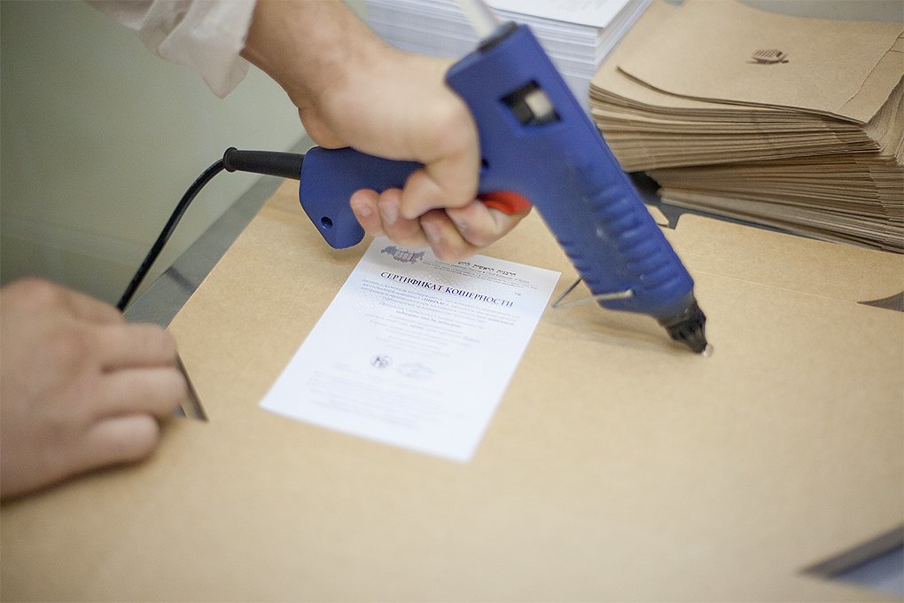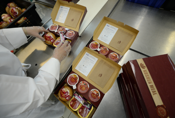 На каждую из коробочек с едой приклеивается сертификат кошерности.