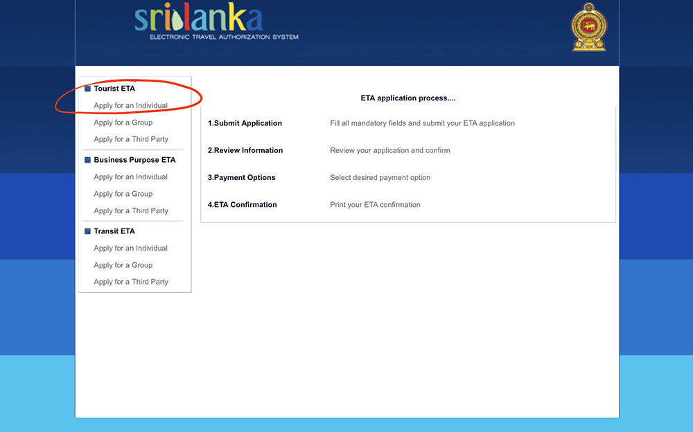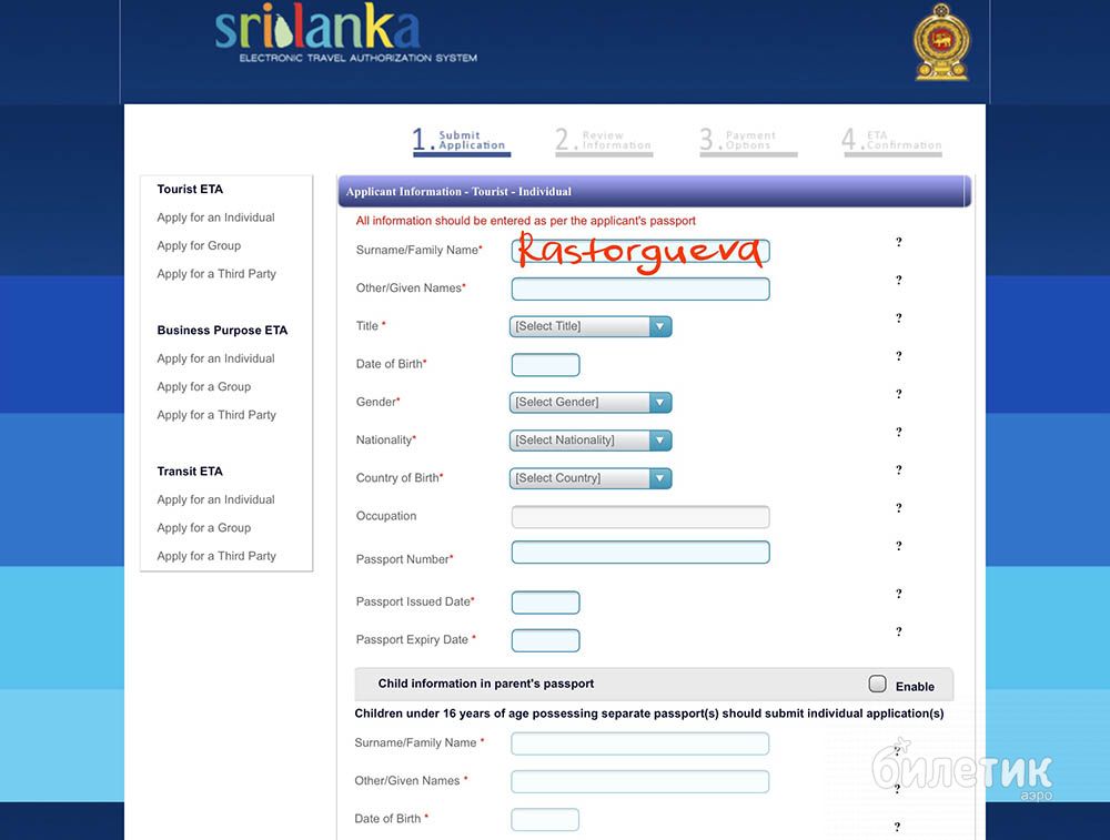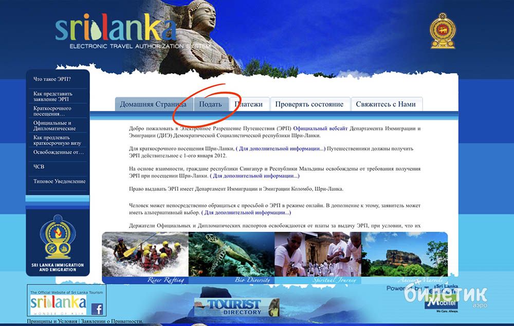 Электронную визу называют ETA — Electronic Travel Authorization или ЭРП — Электронное Разрешение Путешествия. Её можно оформить на сайте eta.gov.lk. Сначала нужно выбрать язык, в нашем случае русский, правда сильно он вам не поможет. Потому что при оформлении самой визы все графы для заполнения будут на английском.