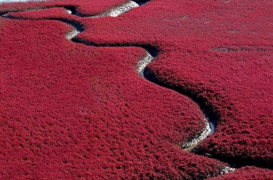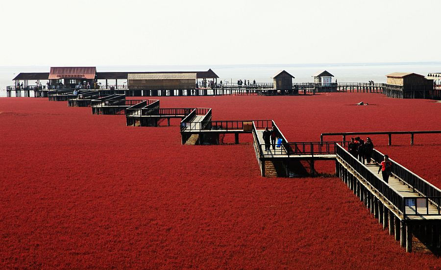 Красный берег — это одна из самых колоритных достопримечательностей Китая. Фактически это тростниковое болото, которое благодаря цветению морской водоросли превращается в яркий, плотный ковёр бордового цвета. Местность имеет статус природного заповедника.