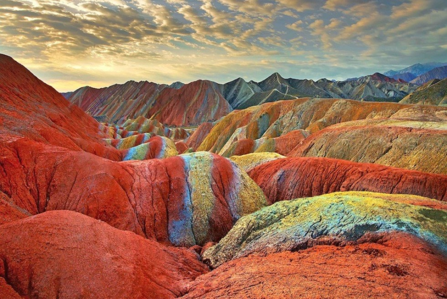 Ландшафт провинции Ганьсу известен во всём мире. Горы стали цветными благодаря разнородным осадкам, мощному скоплению красного песчаника и процессу эрозии почвы.