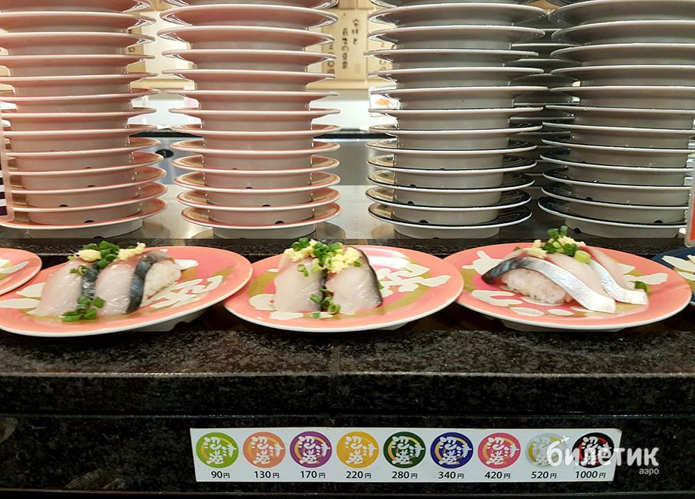 Бывают варианты и без транспортера: повара выставляют тарелочки на стойку, а уж вы выбираете, что хотите. Заметьте: здесь же приклеен стикер с ценами (в йенах, разумеется).