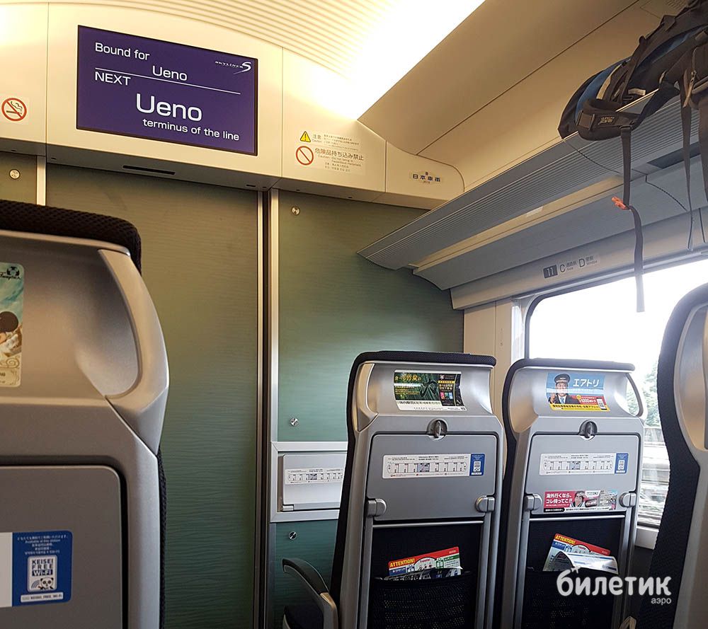 Keisei Skyliner. Конечная остановка — Ueno. 2 отправления в час. Время в пути — 41 минута. Стоимость при покупке онлайн: в одну сторону — 2250 йен, «туда-обратно» — 4380 йен.