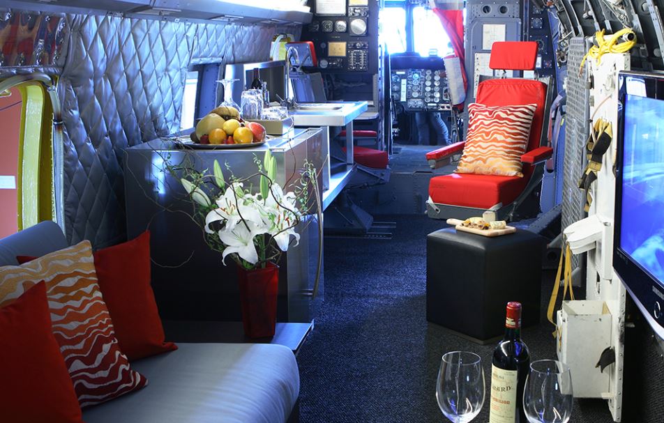 Элементом интерьера гостиничного коттеджа в американском городе Моррис, штат Коннектикут, стал вертолет Сикорского. Вертолет стоит прямо посередине комнаты и играет роль столовой: здесь можно приготовить еду и посмотреть телевизор. Внутри также можно увидеть приборную панель в кабине пилота, инженерные коммуникации вдоль фюзеляжа и иллюминаторы, через которые видна комната. В ней — уже за пределами воздушного судна — расположена двуспальная кровать и другие удобства. Внешне коттедж похож на обычный дом, который в сутки стоит около 800 долларов.