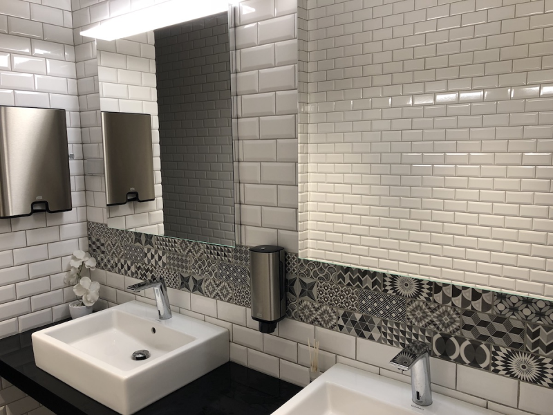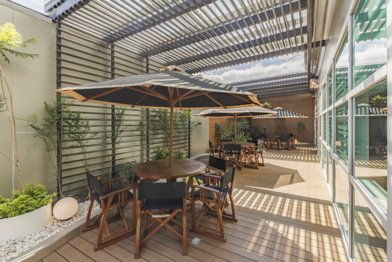 Просторная, залитая солнцем фуд-зона с оригинальными светильниками