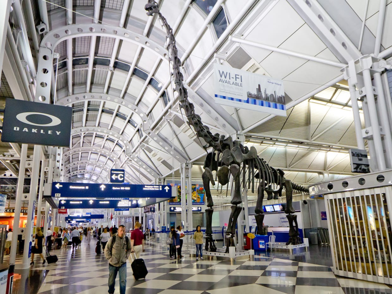 В аэропорту О’Хара пассажиров встречает скелет брахиозавра в натуральную величину. Он является точной копией оригинала, который хранится в чикагском музее.