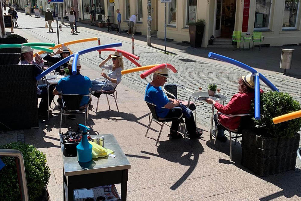 В Германии придумали другой способ защиты. Для соблюдения социального дистанцирования в Cafe Rothe посетителям предлагают надеть на себя необычные шляпы. На головных уборах закреплены аквапалки (или как их еще называют «нудлс») — с их помощью клиенты заведения могут без труда дистанцироваться друг от друга на безопасное расстояние. К тому же и выглядит это довольно забавно, что ещё и поднимает настроение окружающим. Словом, лайфхак из серии «два в одном».