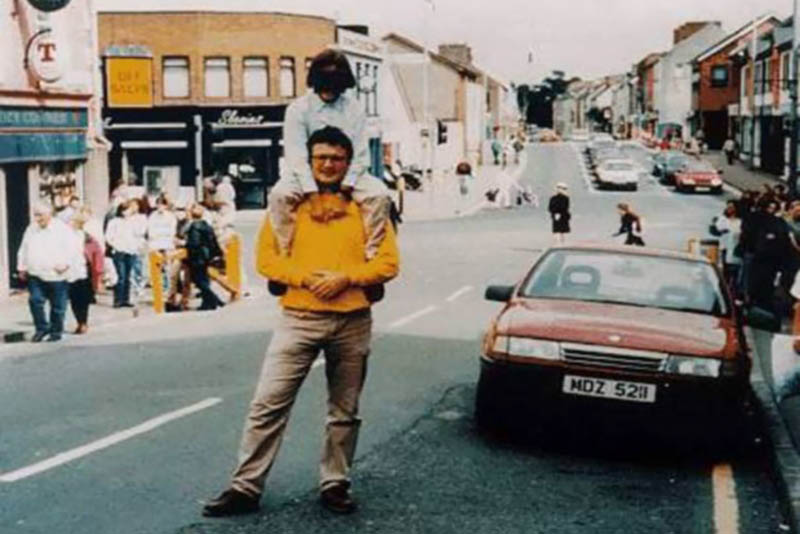 Ирландский город Ом. Обычный, ничем не примечательный день. Мужчина позирует перед объективом фотокамеры со своей дочерью. Рядом, у обочины, припаркован красный автомобиль.