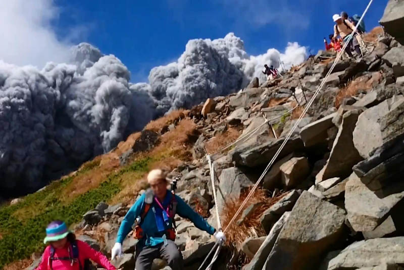 Сентябрь 2014 года. По склону вулкана Онтаке бродят несколько групп туристов. Люди осматривают окрестности, делают селфи, с интересом разглядывают вулканическую породу под ногами. Внезапно из жерла вулкана вырывается лавина камней, пепла и ядовитого газа. Изумлённые туристы бросаются врассыпную, но спастись удаётся немногим.