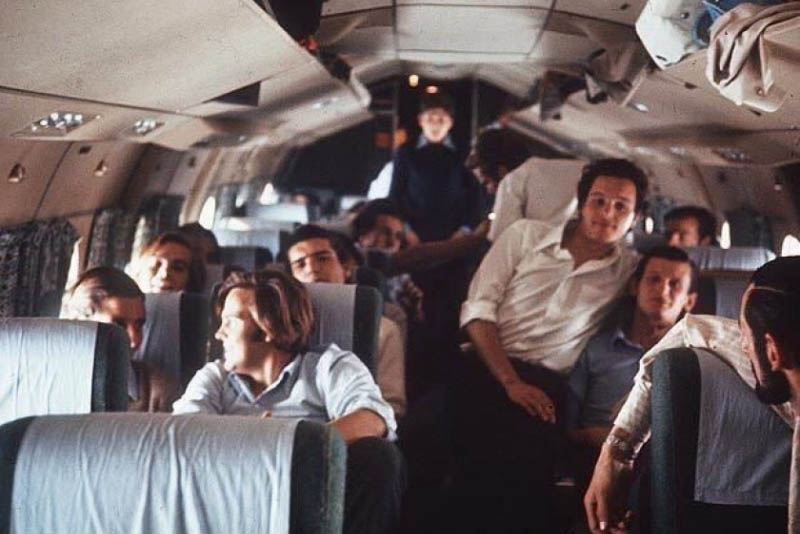 На следующем фото — пассажиры печально известного уругвайского рейса № 571. Они счастливы и беззаботно болтают друг с другом, уютно расположившись в салоне самолёта.