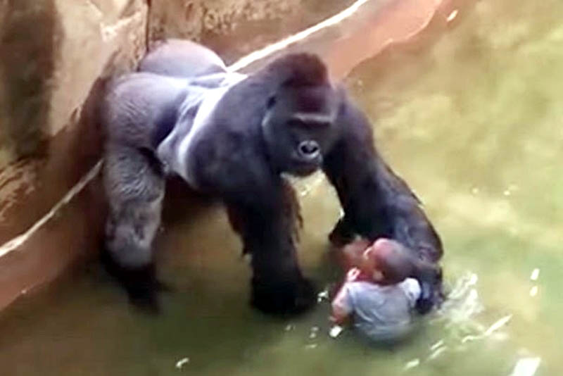 Это случилось в 2016 году в зоопарке американского города Цинциннати. Маленький мальчик упал в вольер с гориллами, которые отличаются своей недюжинной силой и непредсказуемым характером. Один из зрителей сделал этот кадр за мгновение до трагедии.