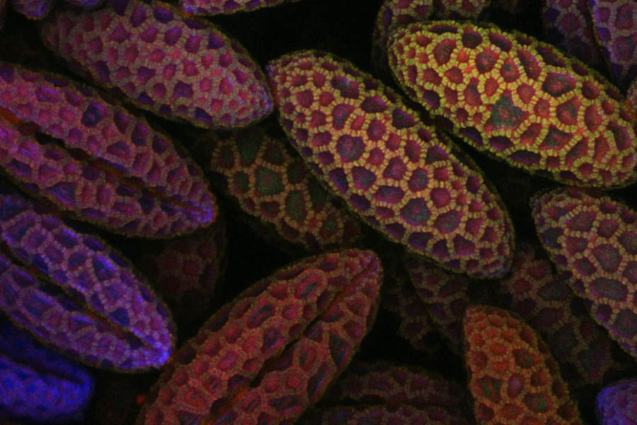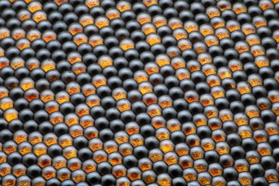 Пыльца одуванчика у глаза пчелы, 120-кратное увеличение