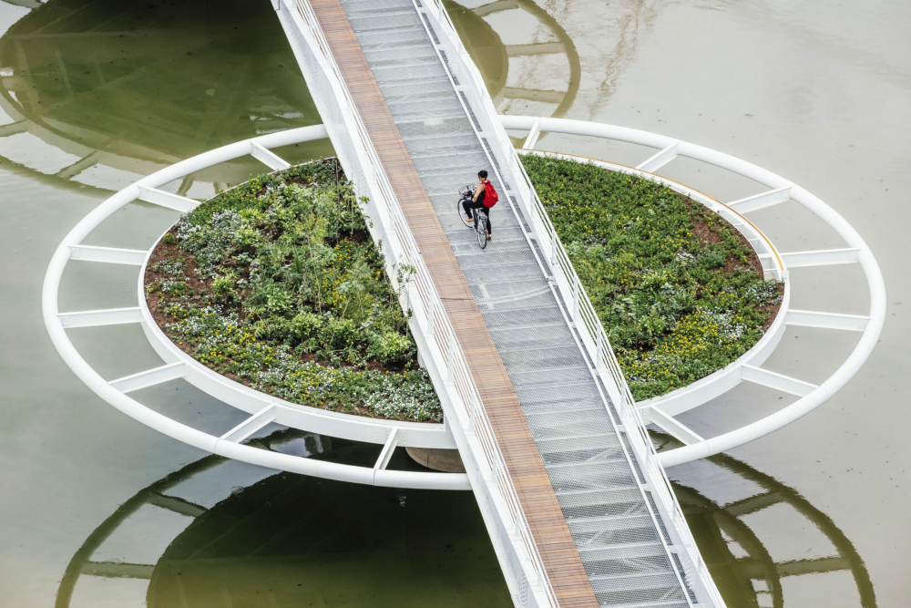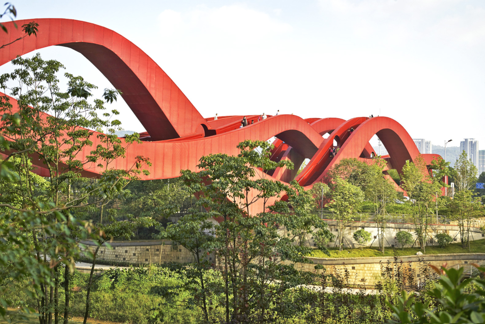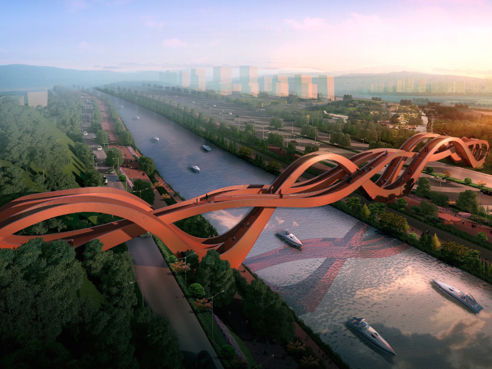 Стальной пешеходный мост Lucky Knot напоминает ленты, сплетённые в традиционный китайский браслет. Сооружение имеет высоту 24 м и длину 185 м. Пока взрослые с интересом разглядывают панорамный вид на реку, дети резвятся на мосту, как на игровой площадке.