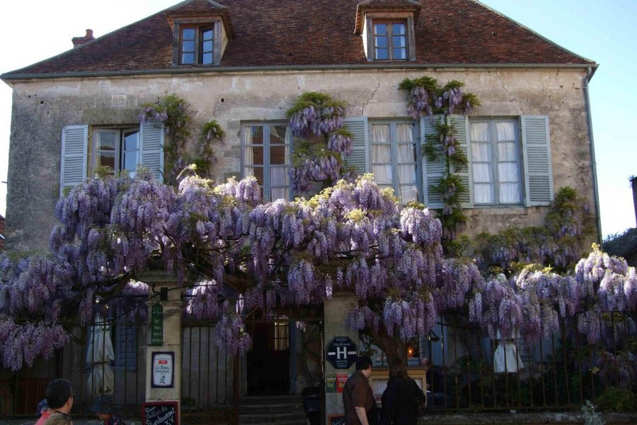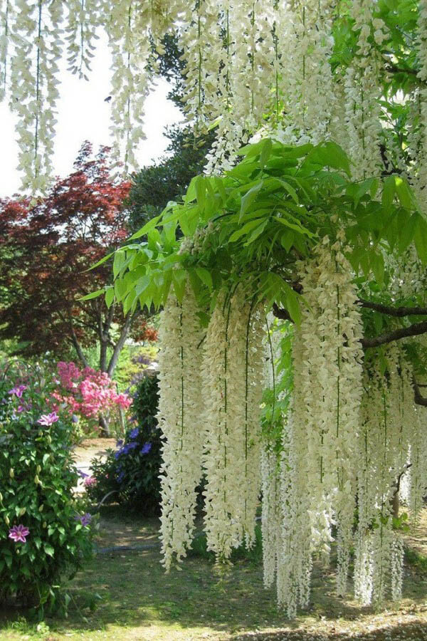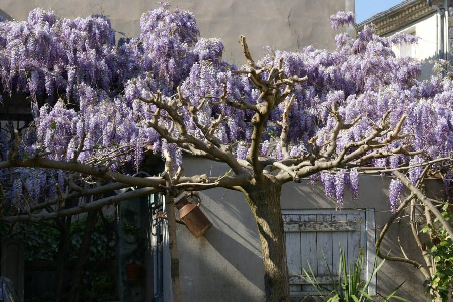 Во время цветения глициния великолепна. Её мелкие цветы, похожие на мотыльков, собраны в крупные длинные кисти, которые свисают с деревьев, образуя эффектный цветной водопад.
