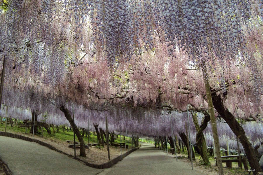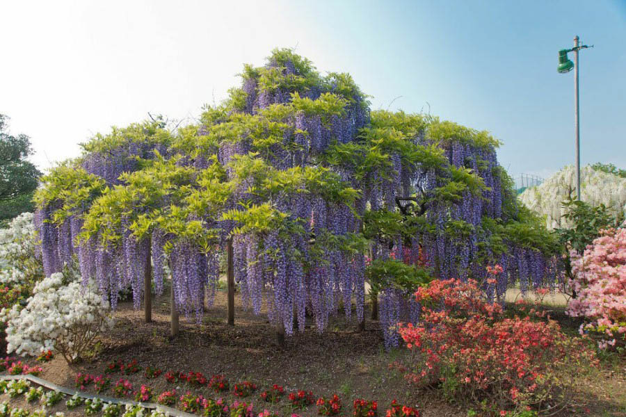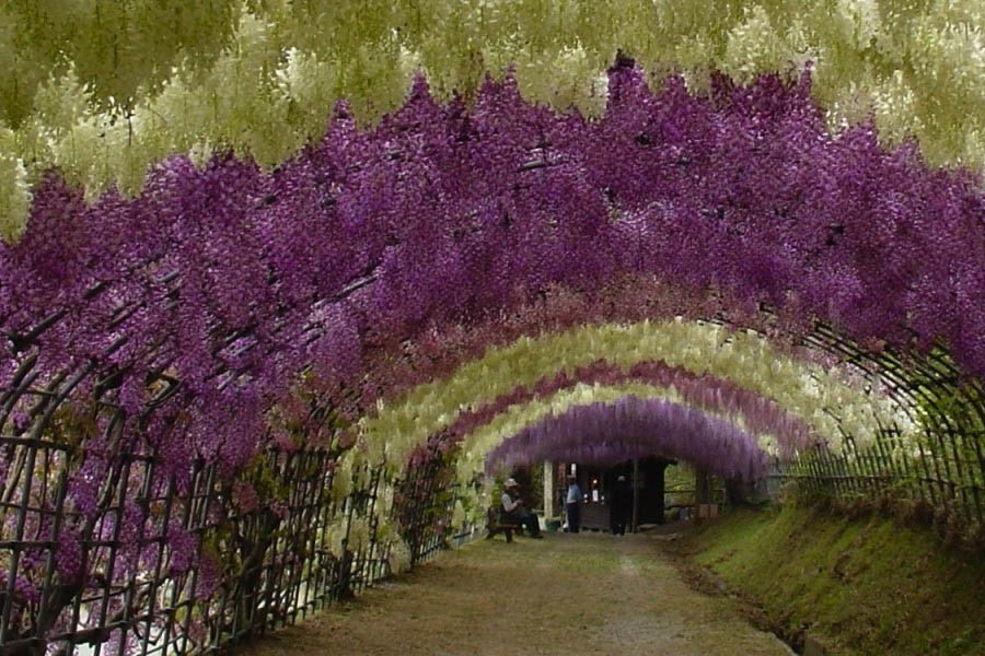 Кроме почтенных глициний-старушек в парке «Асикага» есть около 160 деревьев в возрасте 60 лет. Они образуют длинные тоннели, со сводов которых струится благоухающий водопад белых, розовых и голубых соцветий. Прогулка по таким тоннелям доставляет истинное наслаждение.