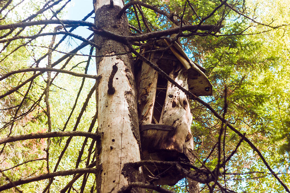 Через несколько метров на другом дереве можно заметить приколоченный к стволу сруб, напоминающий скворечник. Это колода, или как ее еще называют, русский улей. В старину жилище для пчёл устраивали в дуплах деревьев, оно называлось «борть». И когда такое дерево срубали, борть старались сохранить и перенести на новое место.