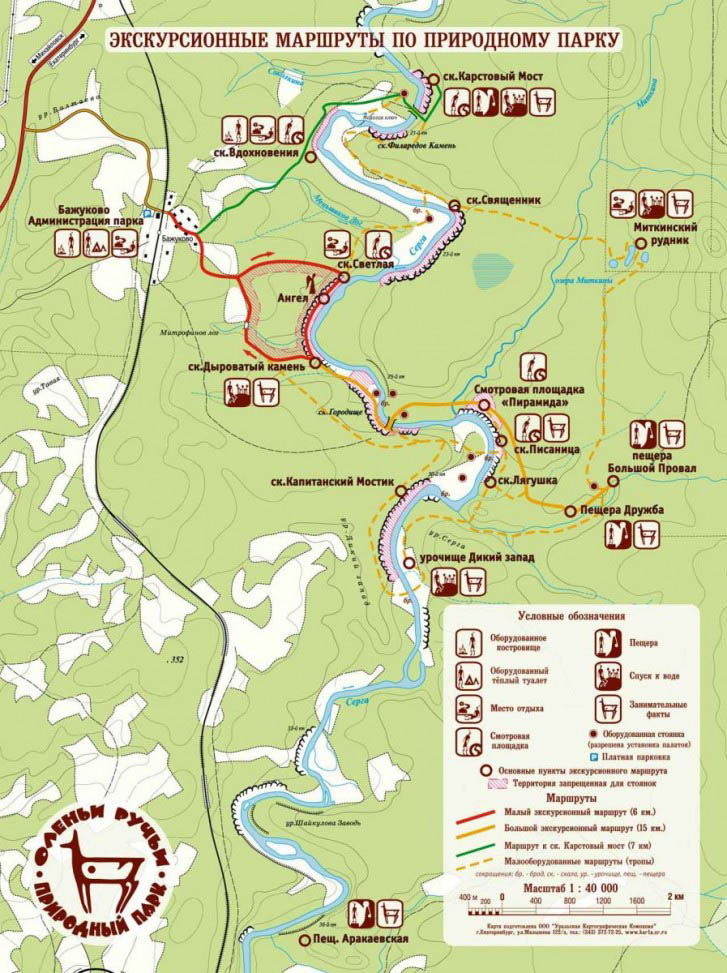 Парк располагается вдоль реки Серга в Нижнесергинском районе, рядом с поселком Бажуково. Благодаря близости воды, скал и леса здесь образовалась особая биосфера. На территории можно встретить папоротники, лекарственные растения, трехсотлетние сосны, карстовые пещеры и глубокие провалы. Особый интерес эта местность представляет для историков и палеонтологов. В пещерах найдены наскальные рисунки, один из которых — олень — украшает официальную эмблему парка. Также на территории парка обнаружена стоянка древнего человека, её возраст более 15 тысяч лет. Сегодня она часть одного из туристических маршрутов.