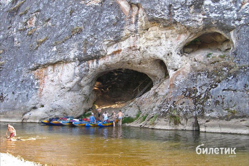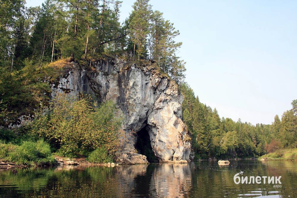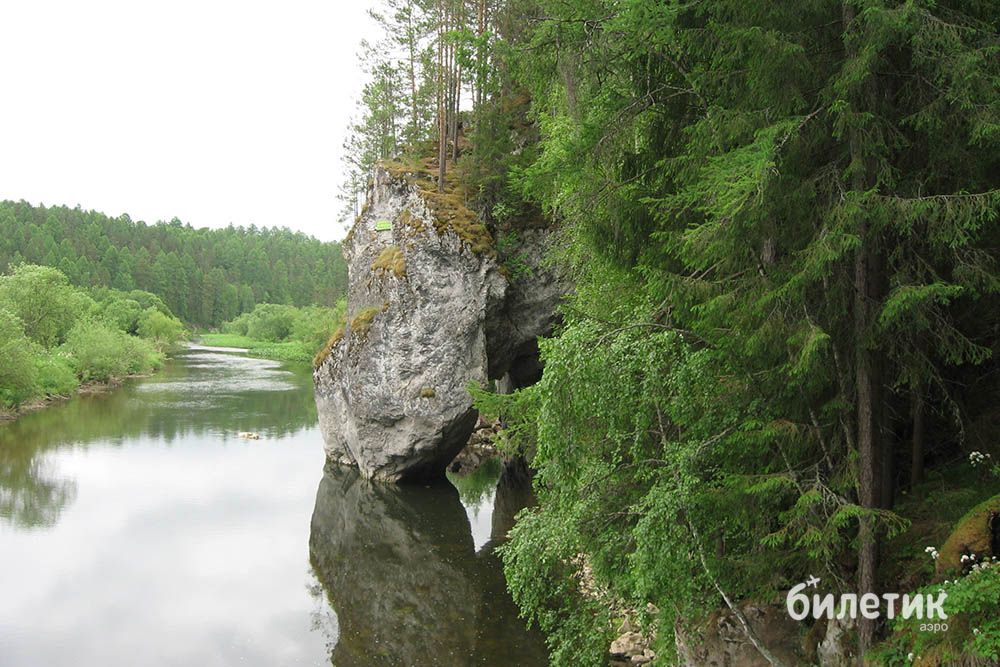 В нескольких метрах от пещеры находится скала Дыроватый камень. Это известняковая арка, один свод которой уходит в воду. Сквозь проём легко можно проплыть на катамаране или лодке. Неофициальное название — Пьющая лошадь, так как силуэт скалы напоминает голову животного, склонившегося над рекой. Лучше всего это заметно с берега. К слову неподалеку образовался маленький песчаный пляж, где любят делать привал уставшие туристы.