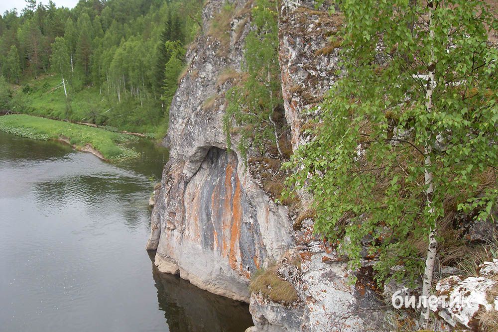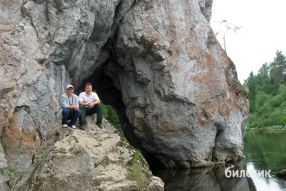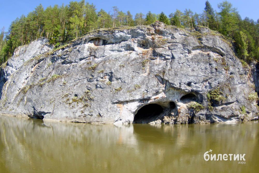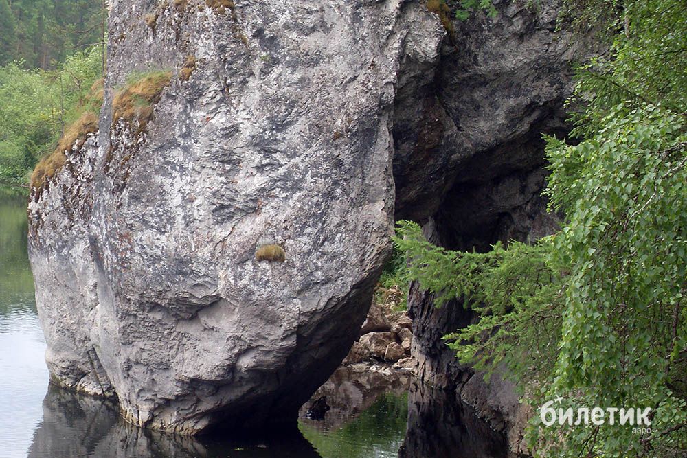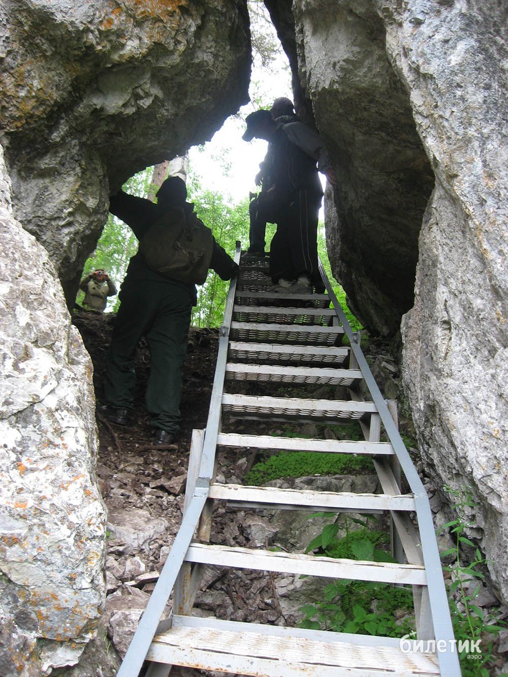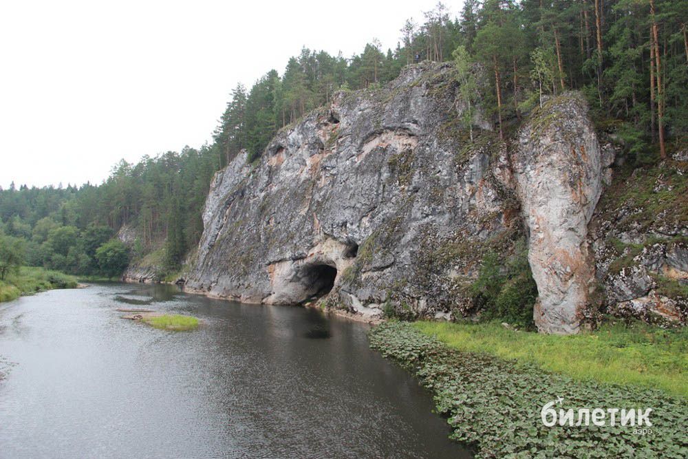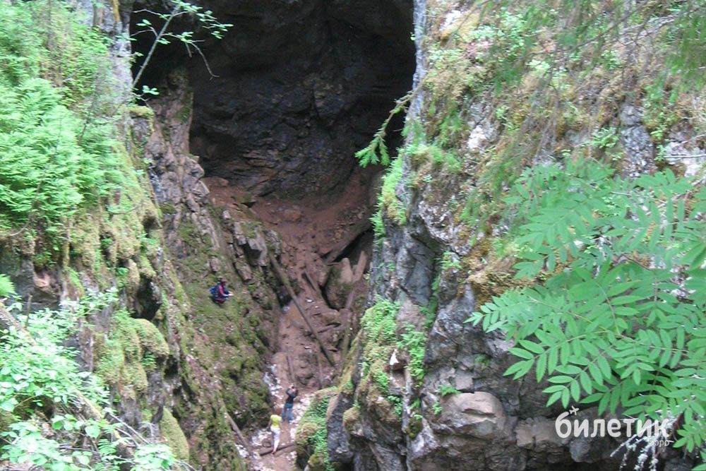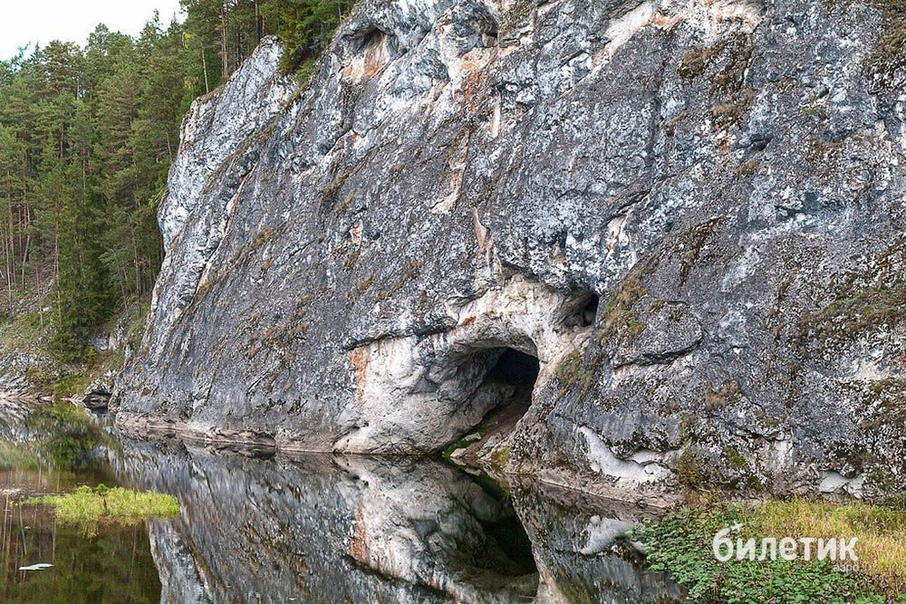 Далее по лесным тропинкам и мостам спускаемся к реке, к Стоянке древнего человека. Это пещера длиной 17 метров, в которой было обнаружено большое количество фрагментов каменных орудий, останков животных, следы костровищ. Самый ранний найденный здесь культурный слой насчитывает 17 тысяч лет. По мнению палеонтологов, эта пещера использовалась как укрытие древними финно-угорскими охотниками.