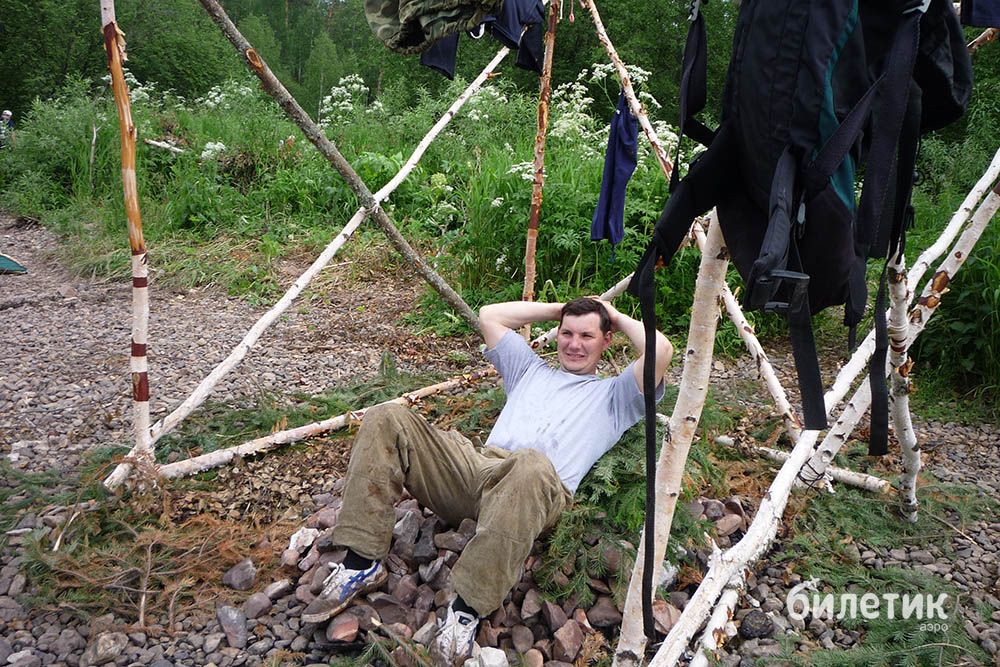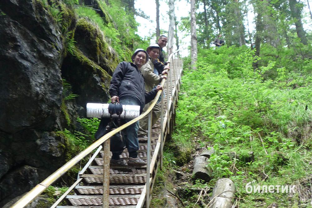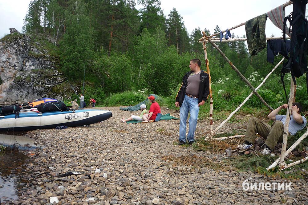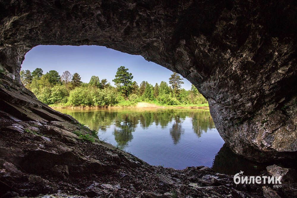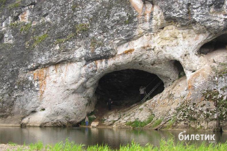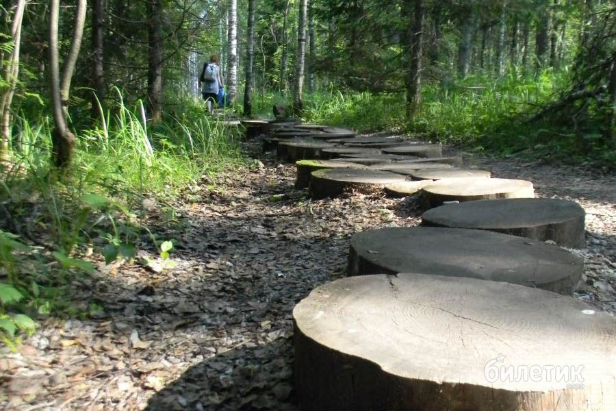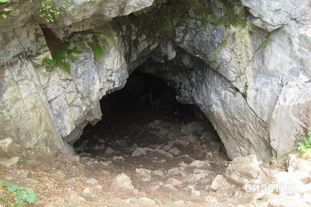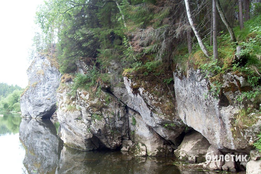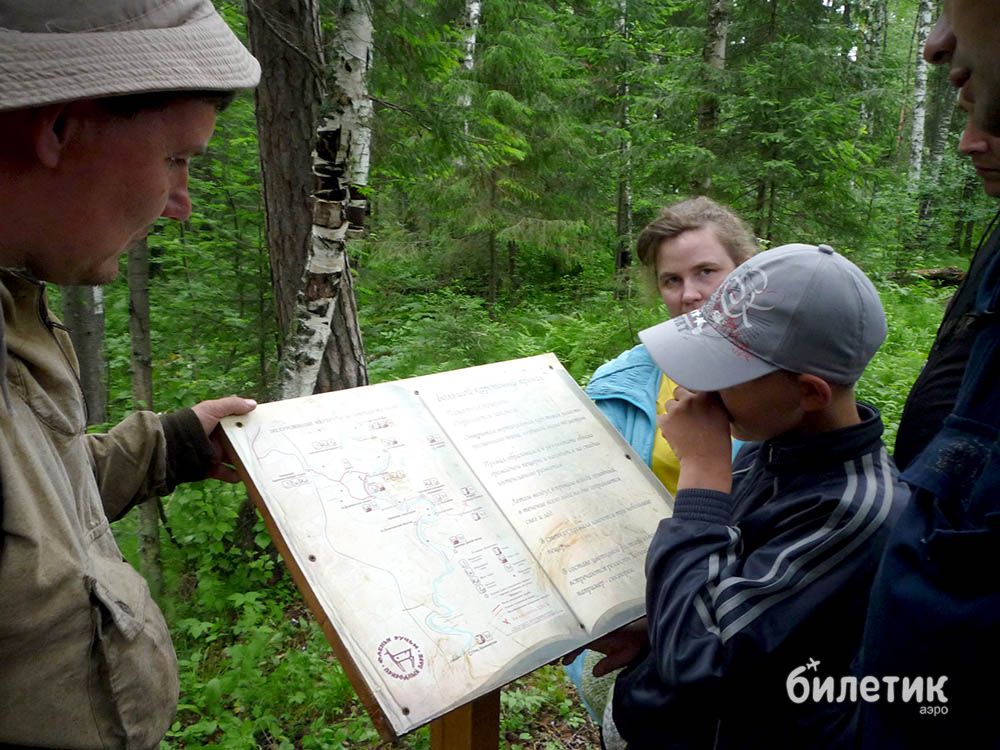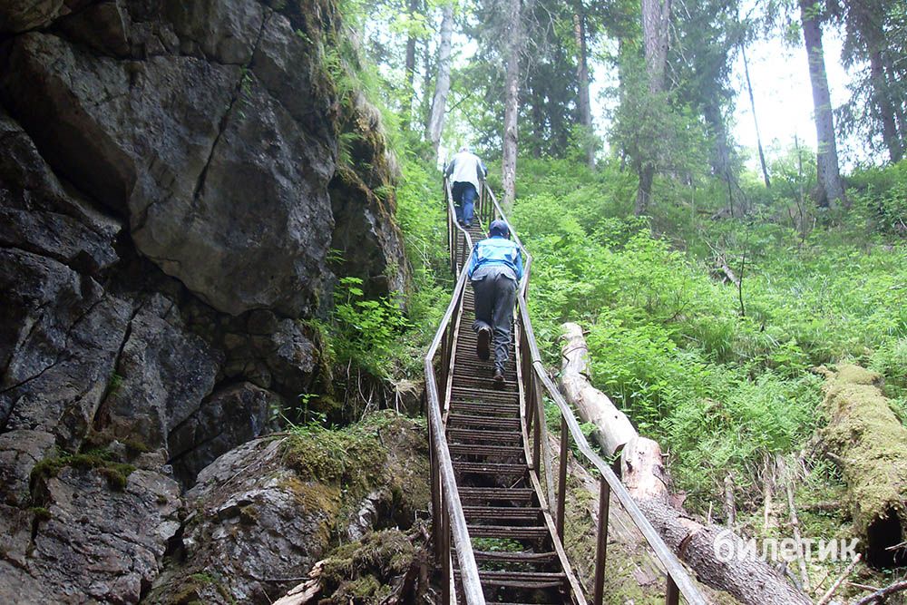 Далее по лесным тропинкам и мостам спускаемся к реке, к Стоянке древнего человека. Это пещера длиной 17 метров, в которой было обнаружено большое количество фрагментов каменных орудий, останков животных, следы костровищ. Самый ранний найденный здесь культурный слой насчитывает 17 тысяч лет. По мнению палеонтологов, эта пещера использовалась как укрытие древними финно-угорскими охотниками.