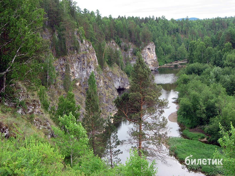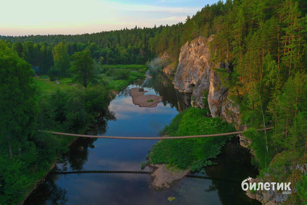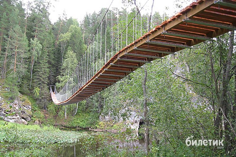 Скалу Карстовый мост можно назвать самой необычной на берегах реки Серга. Её длина 12 метров, а добраться до неё можно по подвесному мосту.