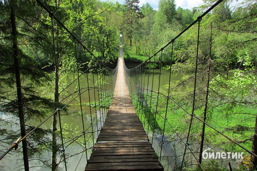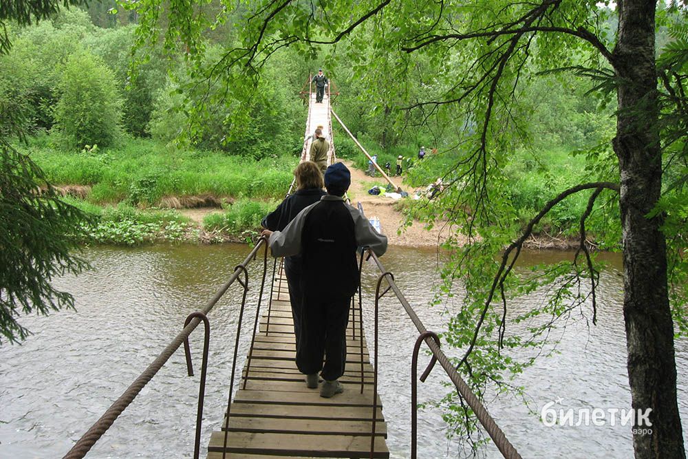 В этой точке посетители тропы Малый круг поворачивают в сторону «цивилизации», более выносливые отправляются в сторону канатного моста. Он не включён в список официальных достопримечательностей, но любим посетителями. Это самый длинный подвесной мост в парке, он перекинут через Сергу. Табличка рядом предупреждает, что находиться на нем могут не больше пяти человек. Остальные точки маршрута находятся на другом берегу, но те, кто боится высоты, могут перейти реку через брод, который находится рядом.