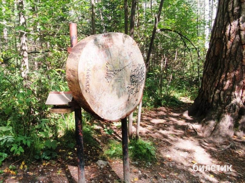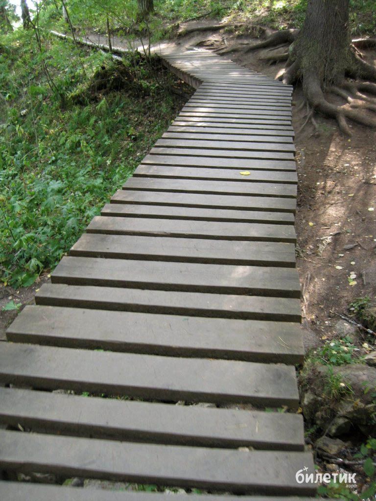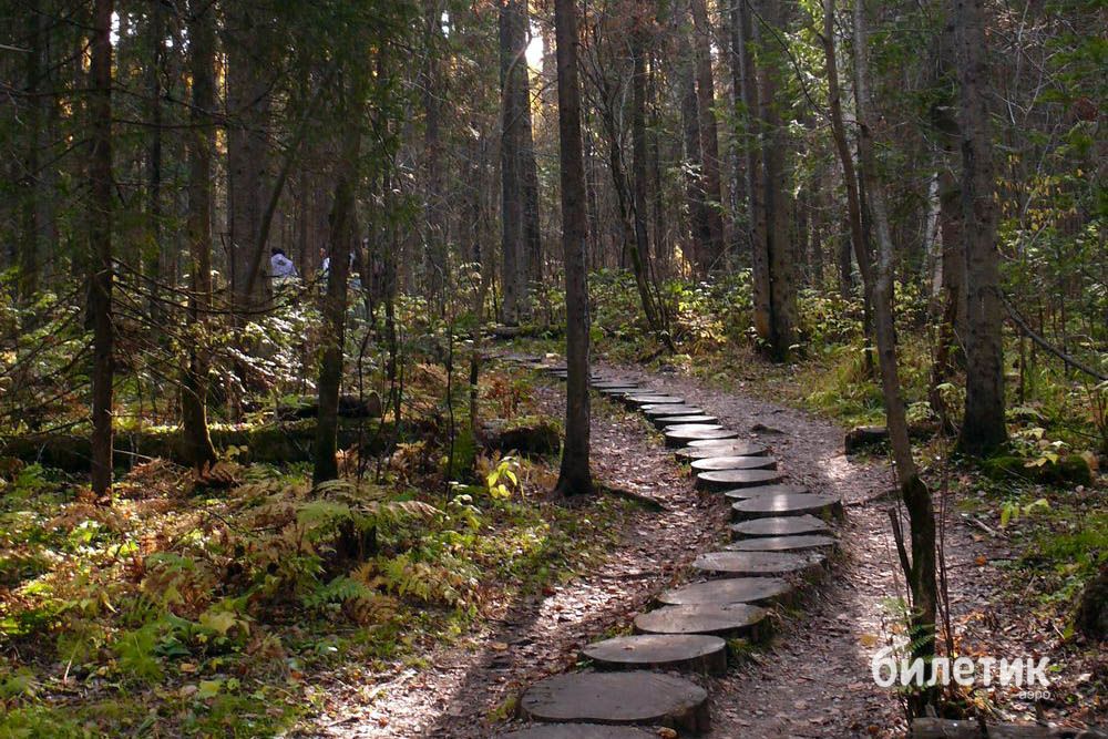 Это конечная точка тропы, время поворачивать назад. Обратный путь лежить по тому же маршруту до Дыроватого камня. Возле скалы поворачиваем налево в сторону администрации парка — это часть кольцевой тропы Малого круга. По дороге можно полюбоваться лиственницей в виде канделябра и небольшой роще с вековыми лиственницами. Детей на этом участке привлекает тропинка из спилов и небольшой подвесной мост.