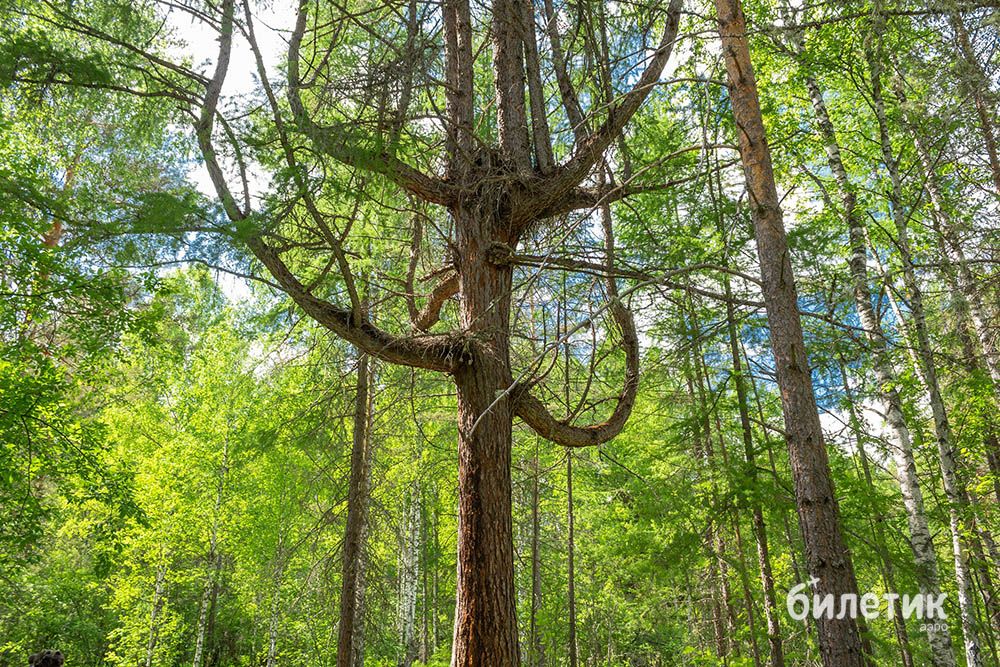 Эта причудливой формы лиственница образовалась по причине того, что из-за сильного ветра была сломана верхушка ствола. Из оставшегося дерева вверх растут несколько стволов. Просто красиво, полюбуйтесь.