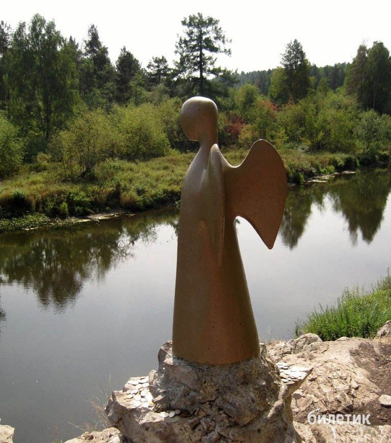 Спускаемся вниз, проходим через арку и попадаем к Ангелу Единой надежды. Пожалуй, самый известный и самый фотографируемый памятник парка. Скульптура появилась относительно недавно, в 2005 году, но уже стала неофициальным символом «Оленьих ручьев». Это связано с тем, что Ангел находится в очень живописном и легкодоступном месте: на утесе над рекой. Будьте готовы к тому, что для фото вам придется немного постоять в очереди — здесь всегда много туристов, желающих загадать желание и бросить монетку к основанию скульптуры.