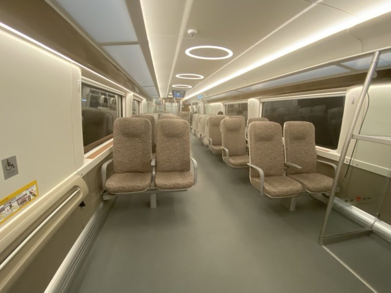 Расположение мест в бизнес-классе по схеме 1-2, каждое кресло оборудовано откидывающимся столиком, лампой для чтения и зарядным портом USB. Стандартный класс имеет конфигурацию 2-2, где все сиденья оснащены USB-разъёмом для подзарядки мобильных устройств.